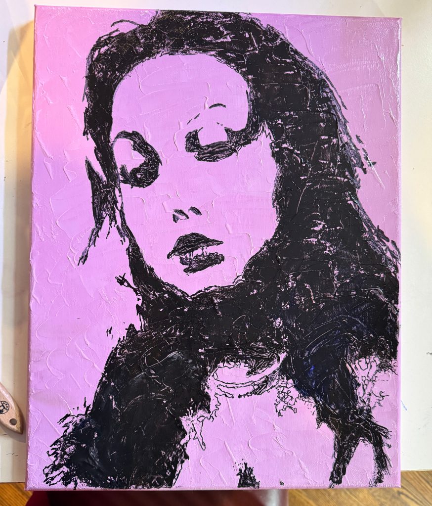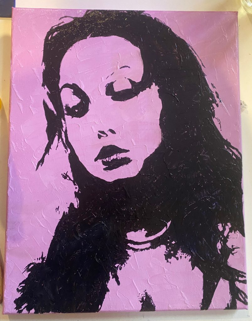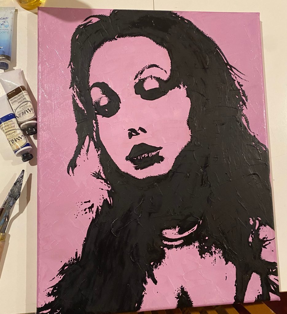 After a few more coats, I used a smaller brush to start applying some of the details, especially around the edges of the outline. I got it to a true dark black (the contrast was crucial for me) and then went in with a Sharpie to fill in all the edges and details from the reference photo. I went in with a tiny brush and some ivory black oil paint to add some of my own details, stippling the shadows and filling in some more of the facial features. I also made the hair and neck more detailed, keeping the abstract look but making it my own. I was really nervous at this stage; part of me wanted to leave it because I was afraid of ruining it by adding too much. At one point, I thought I had messed up the lips and had a small mental breakdown over it. Nonetheless, I actually really like how it turned out. I think it looks more artistic and less realistic, but you can still tell that it’s me (with some exaggerated features).