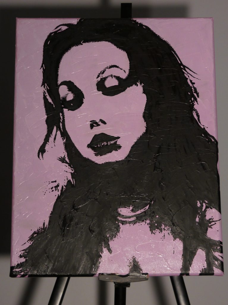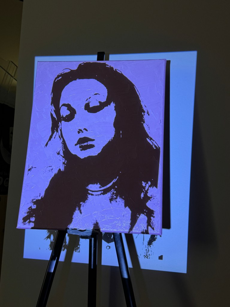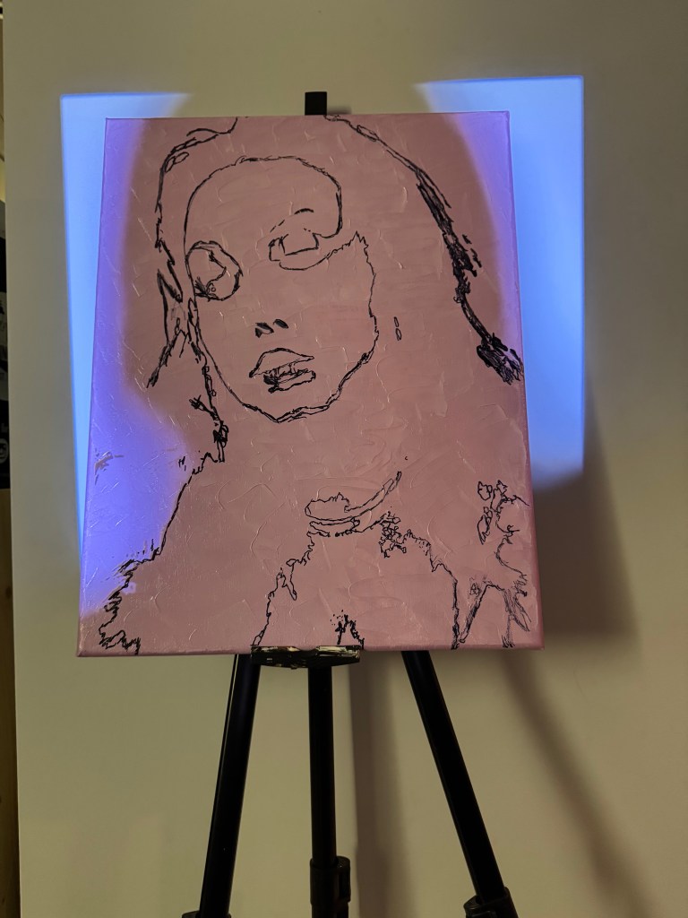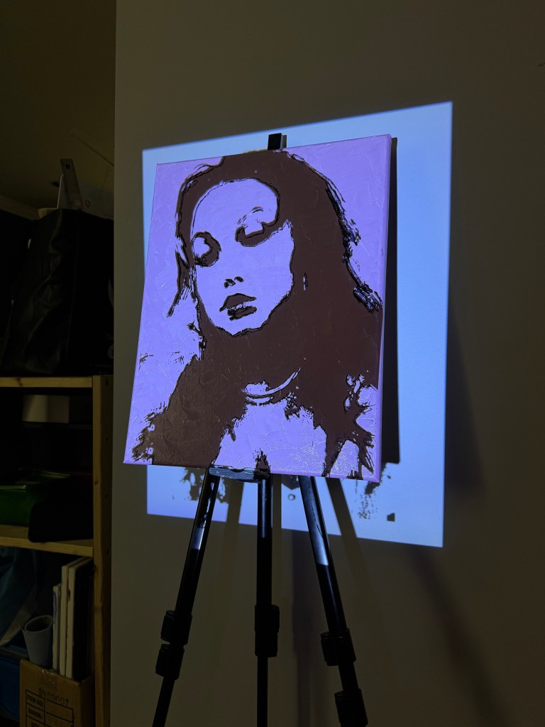 It took over a week for this base to fully dry, and by the time I started working on the portrait, there was still a bit of pink blending into the black, which was very annoying. Once it had dried enough, I propped the piece on an easel and set up the projector with the reference image. This was a taxing process in itself since I was working with what I had (I did this in my basement with the projector stacked on books until it was at the right height and distance). After painstakingly setting up the projection, I had to carefully start tracing the lines with a Sharpie; with a shaky easel, finicky projector, and thick textured canvas, this was another difficult task.