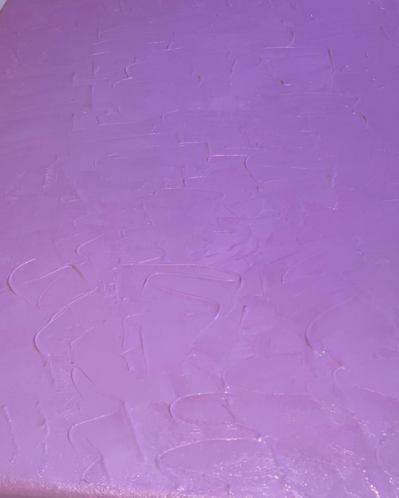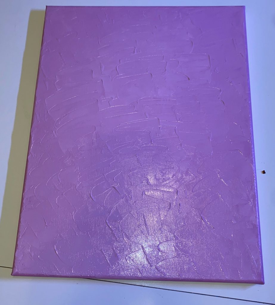 To create the piece, I first primed the canvas, using Gesso to smooth the base and let it dry for 24 to 48 hours. After it was completely dry, I mixed Magenta and Titanium White Gamblin oil paints with linseed oil and a palette knife until I got the perfect light pink I wanted. I then went a little crazy, slathering the canvas with paint using a palette knife and playing around with texture until I found the desired technique. I achieved the final base texture by making short horizontal waves with the palette knife in a downward motion, creating a ribboning texture. I didn’t have any inspiration for this technique; I just experimented with the paint, aiming for a thick texture when it was left to dry.