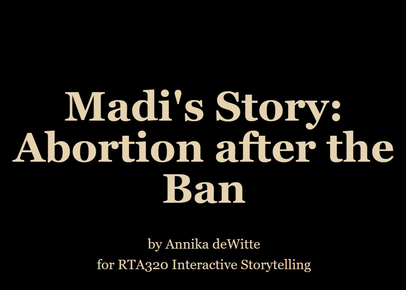 Madi’s Story: Abortion After the Ban was a story I wrote in Twine in 2022 based on a news article, which I updated in 2025. I was the creator, editor, storywriter, and lead programmer of the interactive story game.