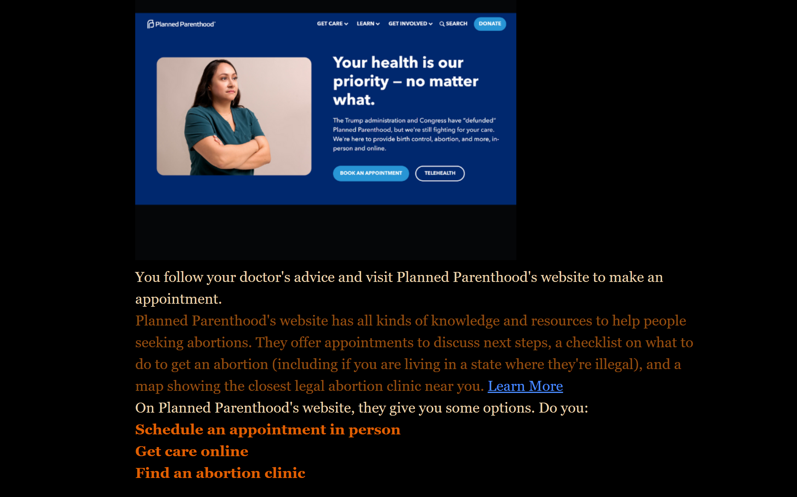 Continuing the narrative, you call over 30 clinics in legal states and the closest available clinic that can give you an appointment is in Albuquerque, New Mexico, over 450 miles away. You can choose to go alone, with a friend, or with your mom for support. You can also get financial support for travel costs and the procedure, or pay for it yourself. I’m basing the clinic on a real abortion clinic in Albuquerque called Southwestern Women’s Options, since the Mississippi clinic in the article no longer practices abortions. In 2022, this abortion clinic had the most reviews and the highest rating of all the clinics in the city, including ones from actual Texan residents who travelled there to get abortions. Although you must deal (either calmly or not) with anti-abortion protestors outside the clinic, you will go through with a calming, safe procedure, and all the staff will be friendly and supportive. This is where the main narrative arc ends, with one possible ending being that you had a comfortable but emotional experience at the abortion clinic and went home back to your life as a 21-year-old college student with no baby. Up until this point, in the spirit of my body, my choice, you will get many choices where you can decide if you still want to go through with the abortion or not, always leaving the possibility for your path/story to change. I included notes on how privileged the main character of this story is, since she can ask her parents for money, get support to come with her on the trip, find an abortion clinic in a neighbouring state that could take her, etc. After the viewer makes their choice, I include a fact or statistic to show how much worse it can be for others in her position. For example, say you choose to go through with the abortion at the clinic and have a safe, successful procedure with no complications. After the choice is made, text appears saying “About 2% of all abortions in the U.S. involve some type of complication for the woman.” (Diamant, 2022). Given the depth of this topic, I will be limiting the number of choices and paths that would be realistically possible to respect timing restrictions, but the story will still explore very plausible narratives of a young woman’s struggle to regain control of her body and fate in the U.S.A.