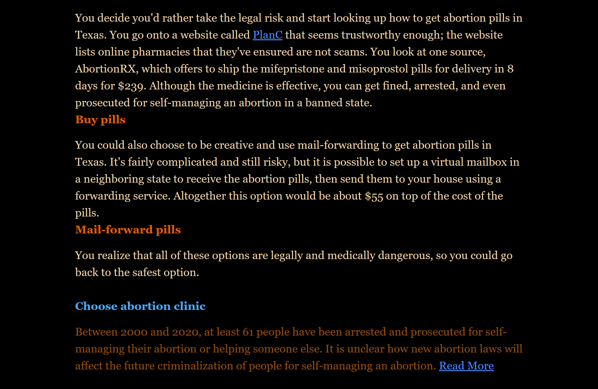 Due to the recent overturn of Roe v Wade, the bill that gave women the right to a legal abortion in all the states of the USA, I decided to base my interactive story on a news story about a 21-year-old Texas college student named Madi who had to travel across state lines to get an abortion. She shared her story because she recognizes that many women won’t have the same emotional and financial support she had throughout the process, and she wants to empower other women in her situation. I give you, the player, many options to decide what you would do if you were in Madi’s position. Some of the possible endings of this story that depend on your choices are: having a successful and